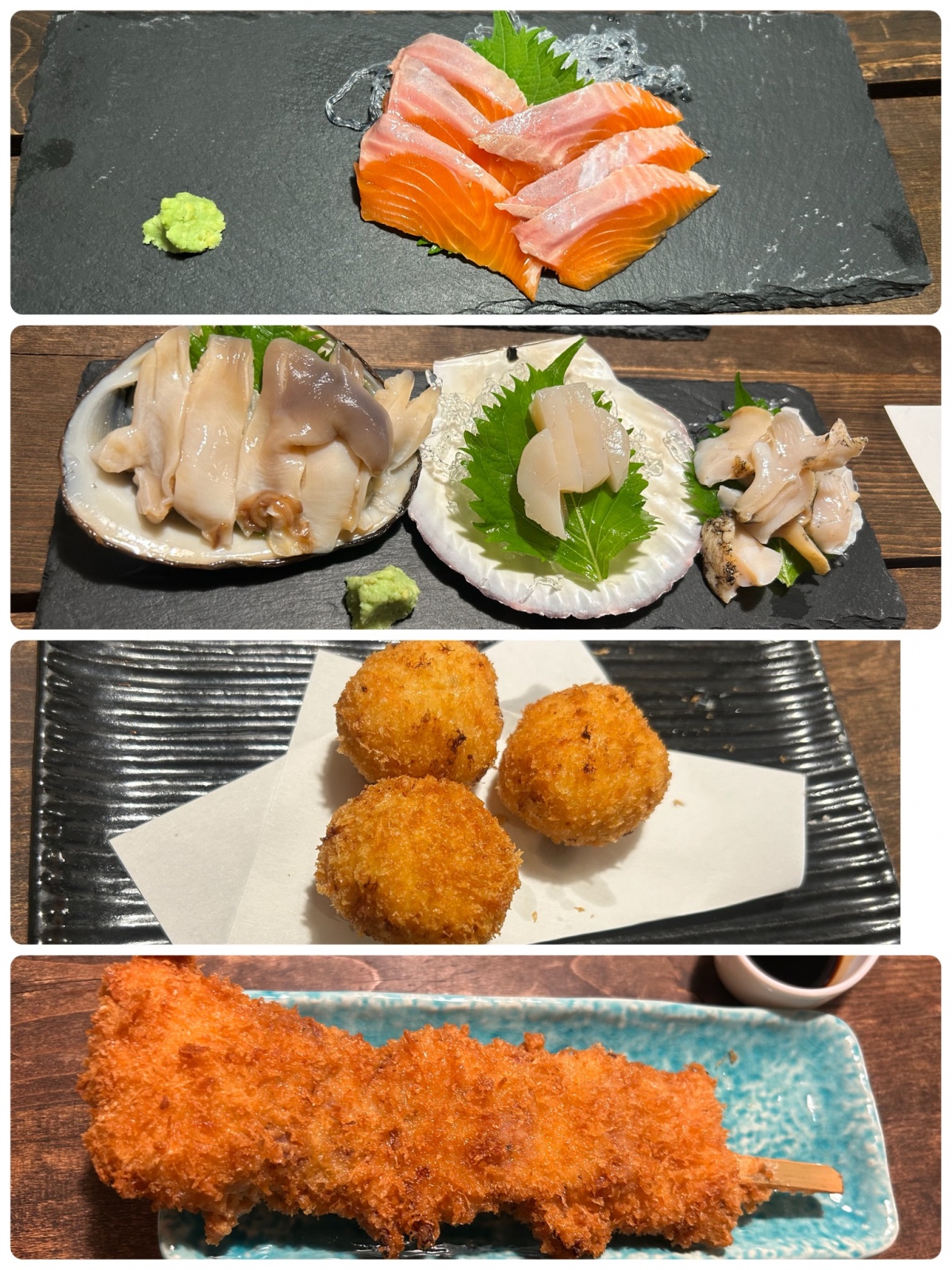久しぶりの外食 美味しい物食べたいと言っていたら。連れて行ってくれました🤗前にタカトシランドで哀川翔さんと訪問していたお店。まずはサーモン貝の3種盛りカニクリームコロッケ富良野豚の究極の串カツ♪どれも美味しかった😊