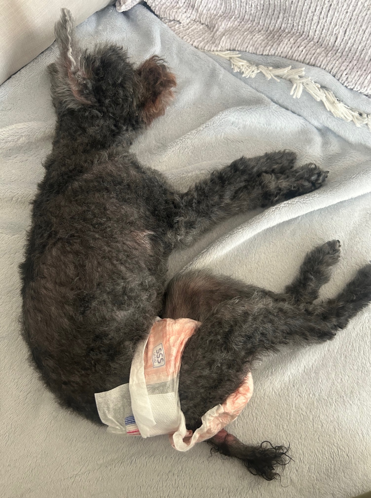 るく だんだんと足腰が弱くなり歩くのもふらふらになって来ていましたが、最近転んでは立とうともがいてるうちに擦れたお尻と尻尾が皮膚炎になってしまいました。軟膏塗っていたのですがなかなか良くならなくて一昨日長い留守番で悪化してしまい💦今日の午前3時頃に痛みで鳴き叫ぶので救急病院へパニック状態になっているからと鎮静剤と痛み止め打ってもらいました。もうひとりで留守番はさせられないね😢仕事中に預かって貰えそうな老犬ホームに明日カウンセリング行って来ます。